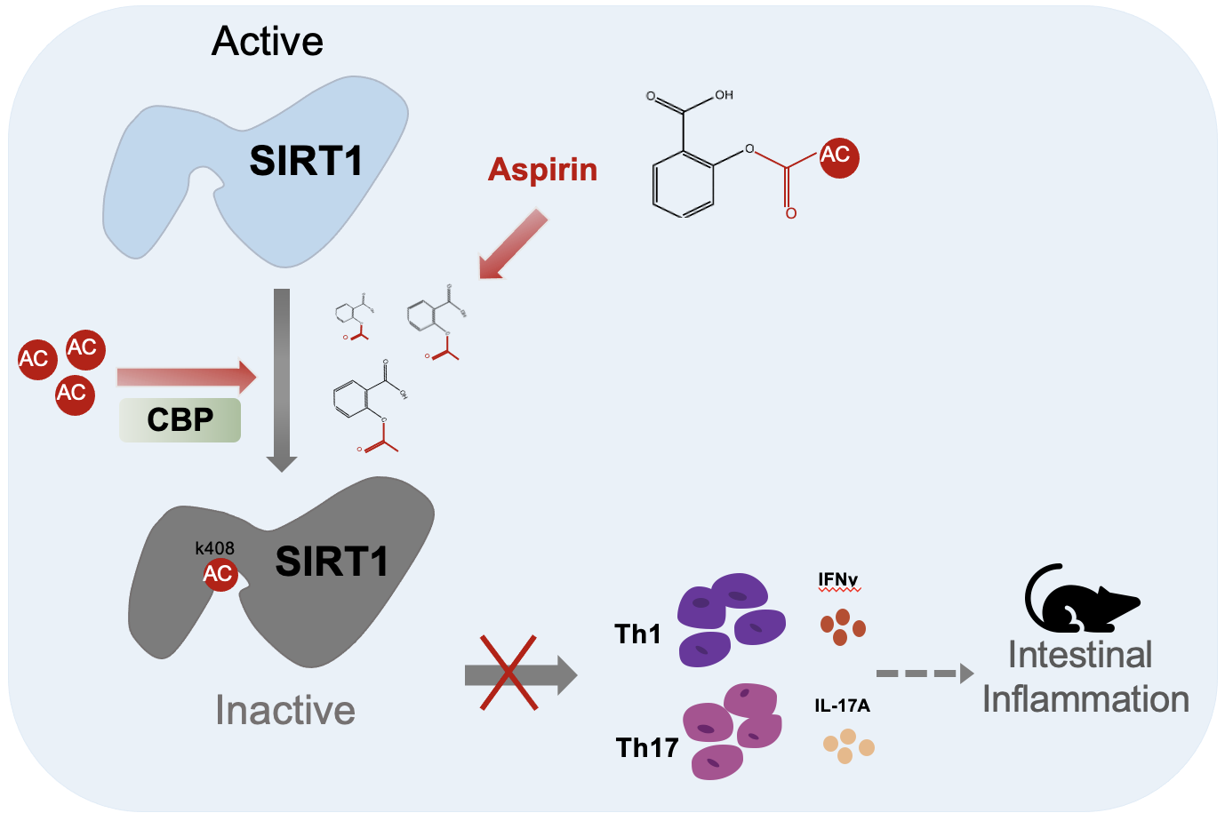 2024年3月,复旦大学余巍课题组在Advanced Science在线发表文章“Aspirin-mediated acetylation of SIRT1 maintains intestinal immune homeostasis”,发现阿司匹林可以直接乙酰化修饰 SIRT1 蛋白的关键位点发挥其抗肿瘤和缓解肠道炎症的重要作用。