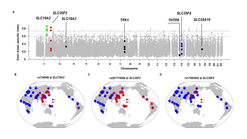 总体而言,该研究发现维生素B1代谢通路相关基因(SLC19A2, SLC35F3, SLC35F4)在东亚人群受到特异性的正向自然选择,其中有的适应性单倍型源自已经灭绝的尼安德特人或类似远古人类的基因交流,并且推断东亚人群特异性的适应性进化很可能发生在东亚地区农业文明之前,提示农业大规模发展以后东亚人群饮食结构的改变并非适应性进化的原初进化驱动力。
