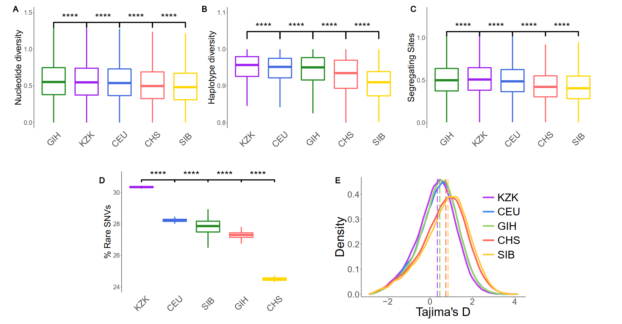 图2 新疆哈萨克族(KZK)及其祖源参考人群的遗传多样性特征。