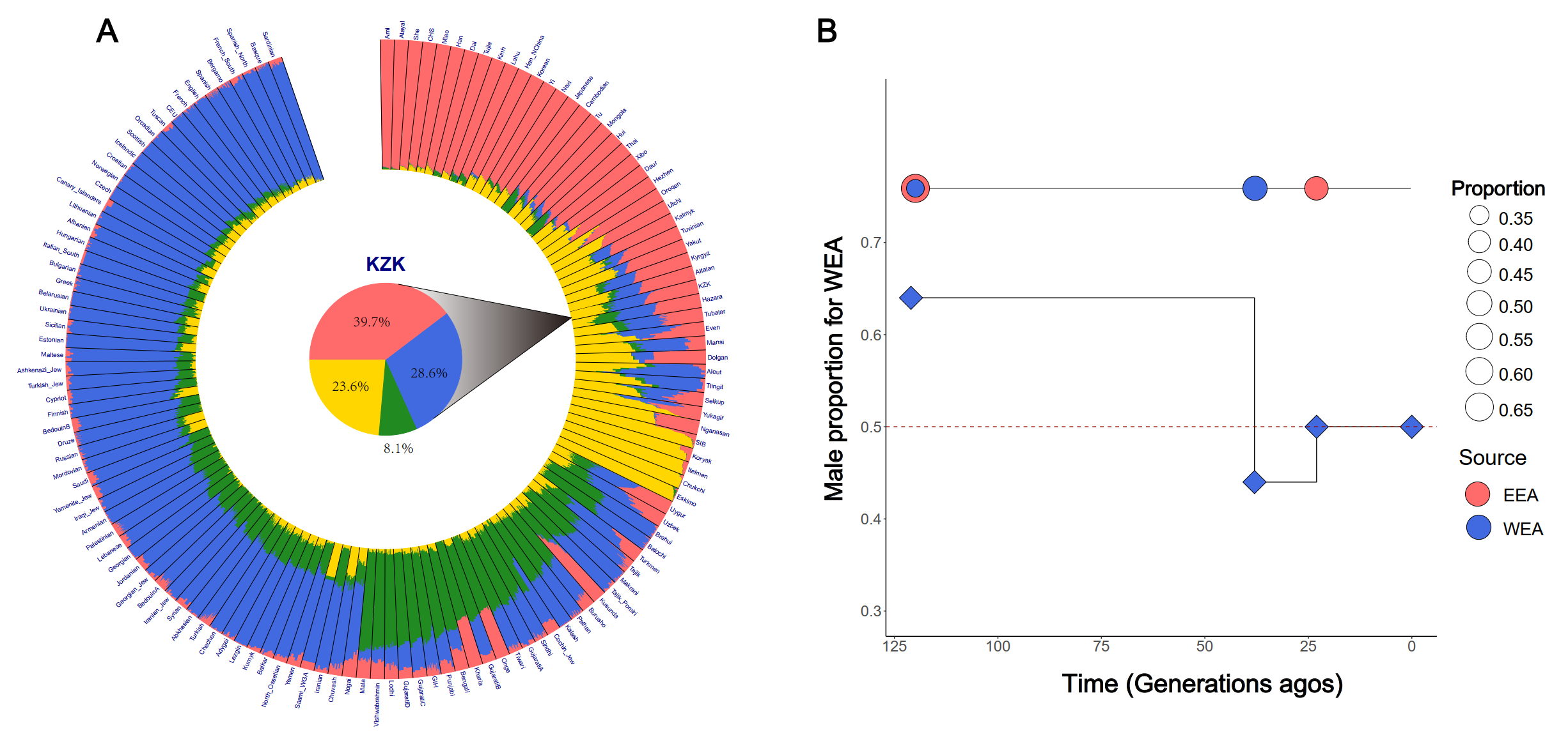 图1 新疆哈萨克族(KZK)的祖源构成及混合历史建模。