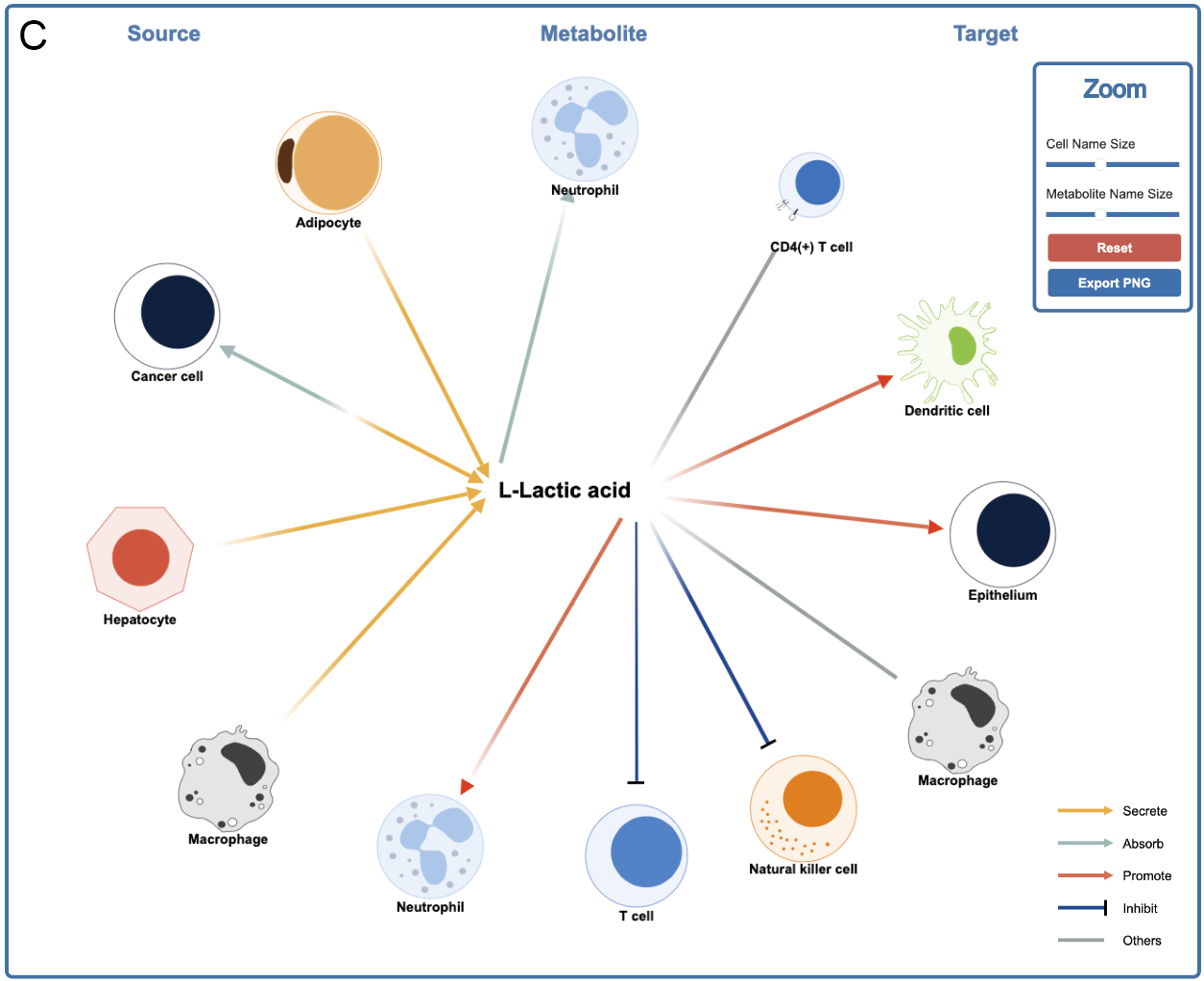 (5)此外,MACC还提供了一个交互式分析/绘图工具CMC-Plot,用于可视化多种代谢物-细胞相互作用网络,便于研究者从庞杂的代谢物-细胞互作网络中梳理关键信息。