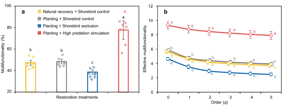 通过进一步测定12种湿地功能,并应用平均值法和等同累计法(effective multifunctionality)分析多功能性,研究发现,水鸟还可通过影响蟹类对土著植被恢复的抑制作用和对土壤的扰动作用促进滨海湿地多种功能的恢复。自然恢复和仅种植海三棱藨草不能提升任何一种湿地功能;排除水鸟模拟水鸟种群的加剧丧失显著降低了沉积物淤积、碳固持、氮累积、土壤重金属净化等湿地功能,使湿地平均多功能性显著降低了20%;相反,排除植食性蟹类模拟水鸟种群丧失前的高强度捕食作用,显著提高了次级生产力、风浪削减、沉积物淤积、土壤呼吸、氮矿化、凋落物分解、碳固持、氮累积和土壤重金属净化等多项湿地功能,使湿地平均多功能性显著提高了61%(图4)。