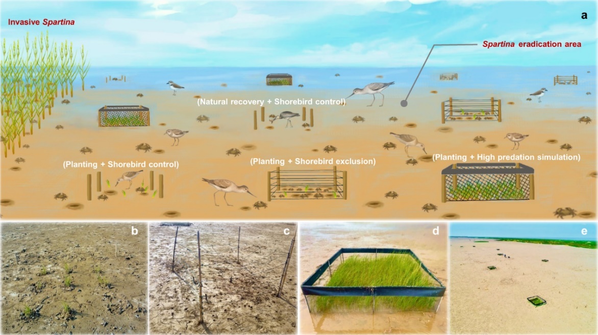 近日,国际综合性期刊Nature Communications发表了复旦大学生物多样性与生态工程教育部重点实验室、上海长江河口湿地生态系统国家野外科学观测研究站贺强教授团队的研究成果“Shorebirds-driven trophic cascade helps restore coastal wetland multifunctionality”,通过在长江口滨海湿地互花米草治理区开展营养级联野外控制实验(图2),研究了水鸟在滨海湿地修复中的生态功能,结果表明水鸟之所以亟需强化保护,不仅是因为其脆弱性、濒危性,更是因为其发挥着重要生态功能。
